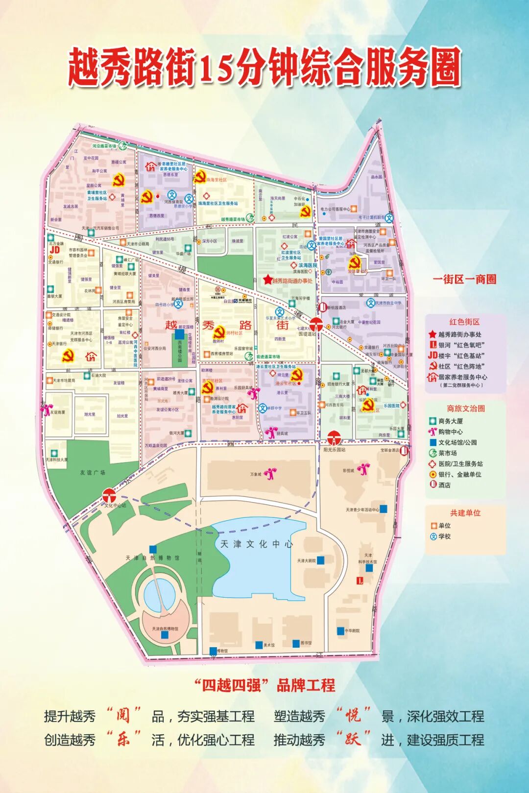 ![]() 党建引领 缔造品质生活 ![]() 红色议事 ![]() 红色阵地 ![]() 红色基站 ![]() 红色氧吧 高品质商业格局 商务会议的绝佳选择 金融产业蓬勃发展的核心区域 ![]() 新桃园酒店 ![]() 甘肃商会 ![]() 北方金融大厦 ![]() 华夏未来体育中心(峰汇广场) 高品质文化体验 文化繁荣的艺术殿堂 徜徉知识海洋、孕育无限希望的沃土 ![]() 国学活动 ![]() 花艺活动 ![]() 植树活动 ![]() 科普活动 高品质活力载体 休闲娱乐的不二选择 首店云集的购物天堂 ![]() 万象城 ![]() 彩悦城 ![]() 津悦城 ![]() 友谊商厦 高品质服务环境 百姓生活的幸福家园 汇聚流年烟火的心灵港湾 ![]() 2023年天津绿色消费季暨第二届品质生活节 ![]() “乐活联盟”启动 ![]() “我们的节日·春节”文艺演出 ![]() 居家养老暖心服务 ![]() 期待在越秀与你相遇 我们携手共赴美好 ![]()