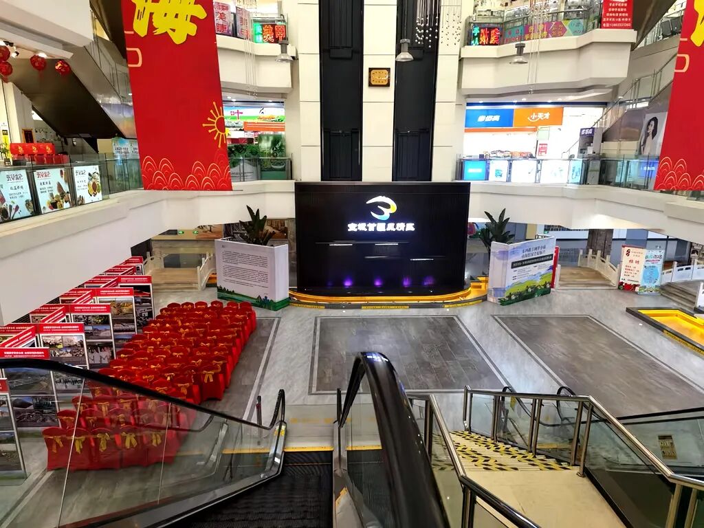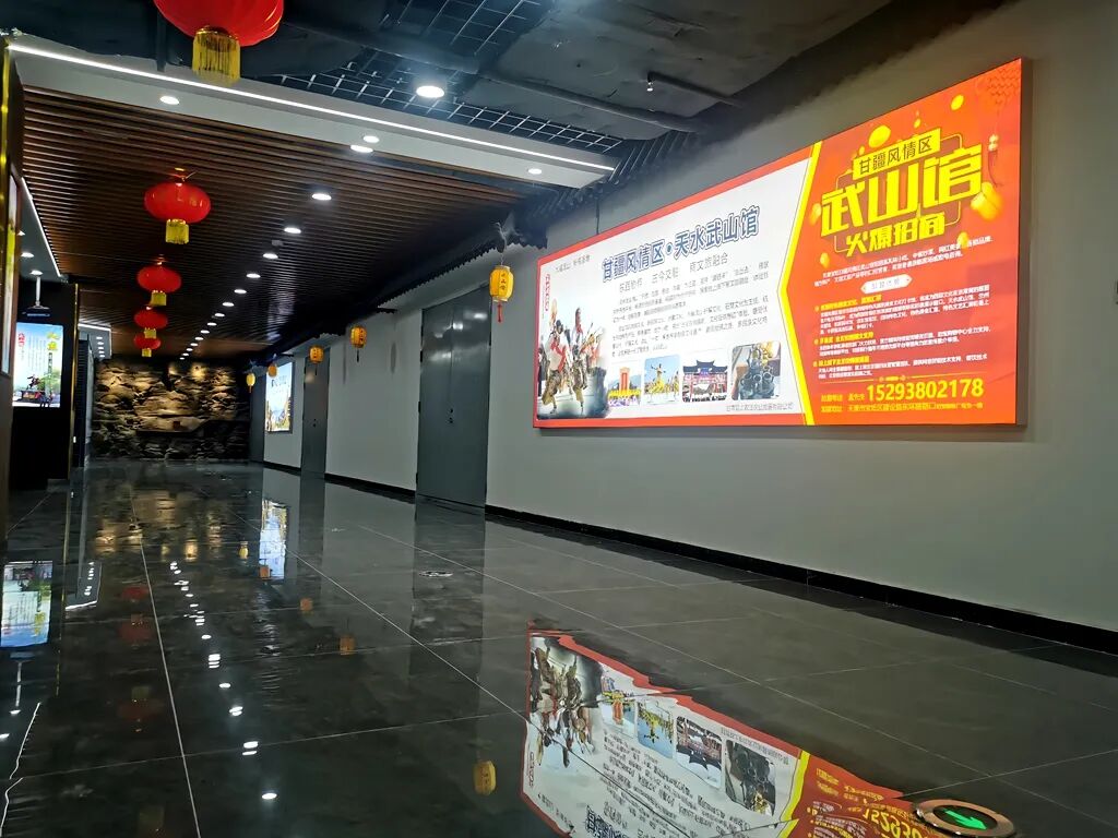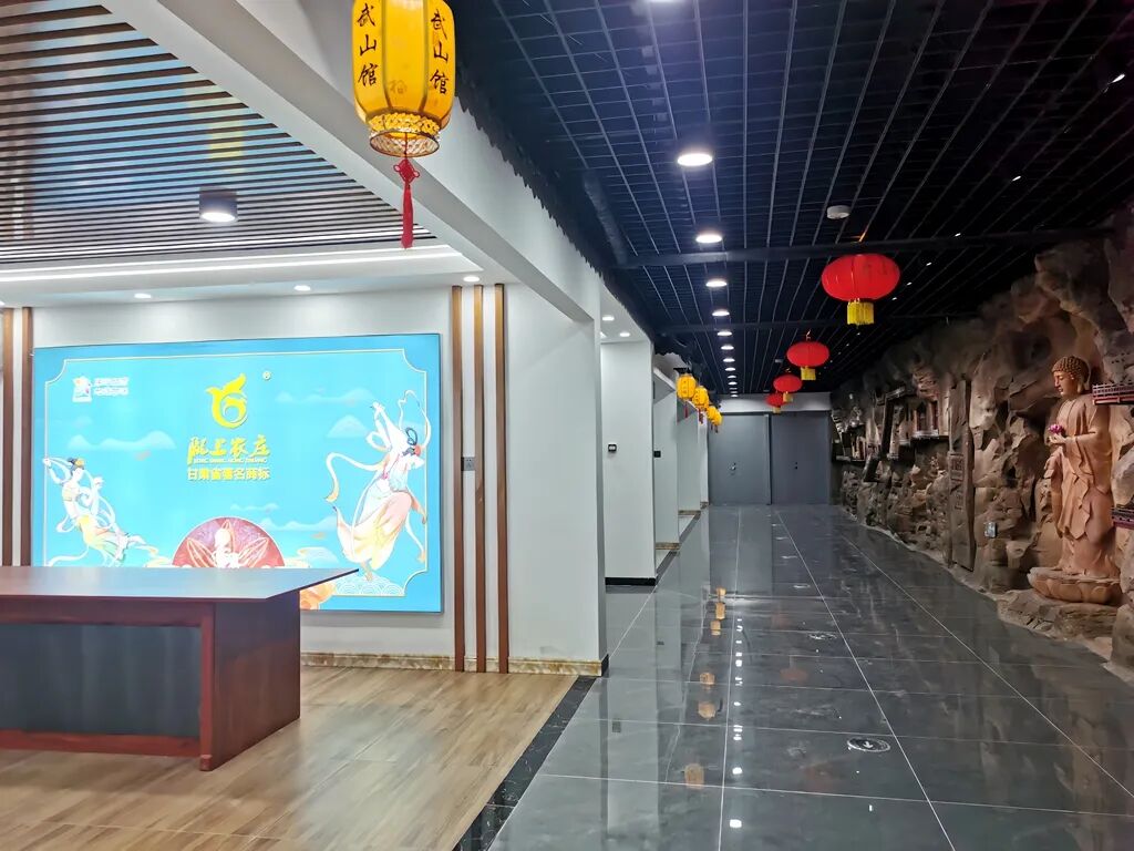 甘疆风情区电梯入口 二、馆区情况甘疆风情区武山馆位于天津市宝坻区劝宝购物广场负一楼,所处宝坻区繁华地段,周边有较多小区,一楼至五楼是大型商城,客流量较大,地理位置优越,发展前景广阔。该馆建筑面积1300平方米,馆内使用面积930平方米,前厅后厨包间宽敞明亮,布局合理;设特色品牌形象店1间,特产销售摊档3间,特色小吃摊档15间,所有档口配备上下水、电力排风到位,中央空间等设施齐全,馆内整体可同时容纳500人就餐购物。馆内装修主要通过麦积山石窟背景墙、特色美食、农特产品和文旅产品广告灯饰、红黄灯笼等充分体现武山县地域特色。